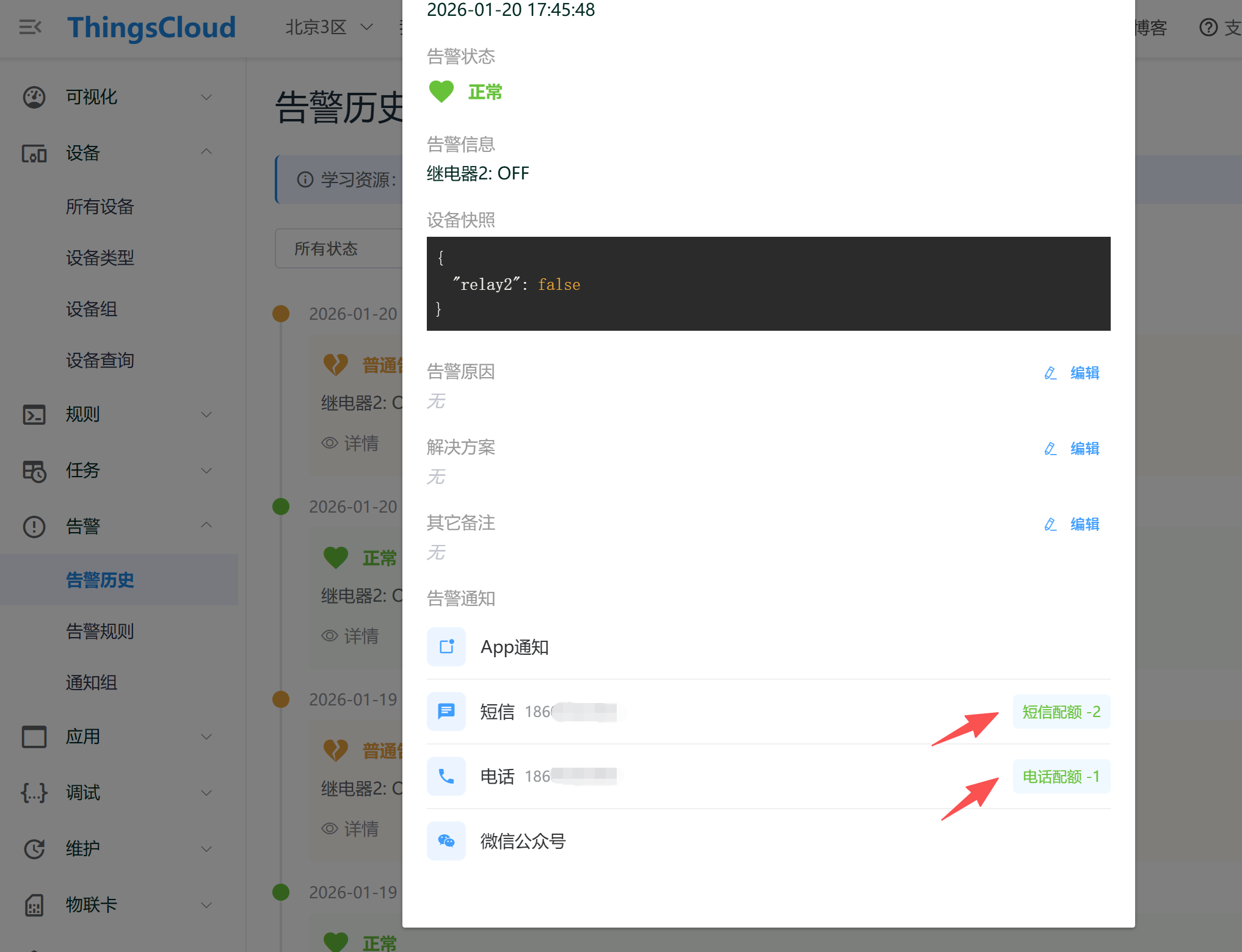 在 ThingsCloud 提供的多种告警通知方式中,邮件、短信和电话通知需要购买相应的通知配额,若配额不足,则无法发送此类告警通知。