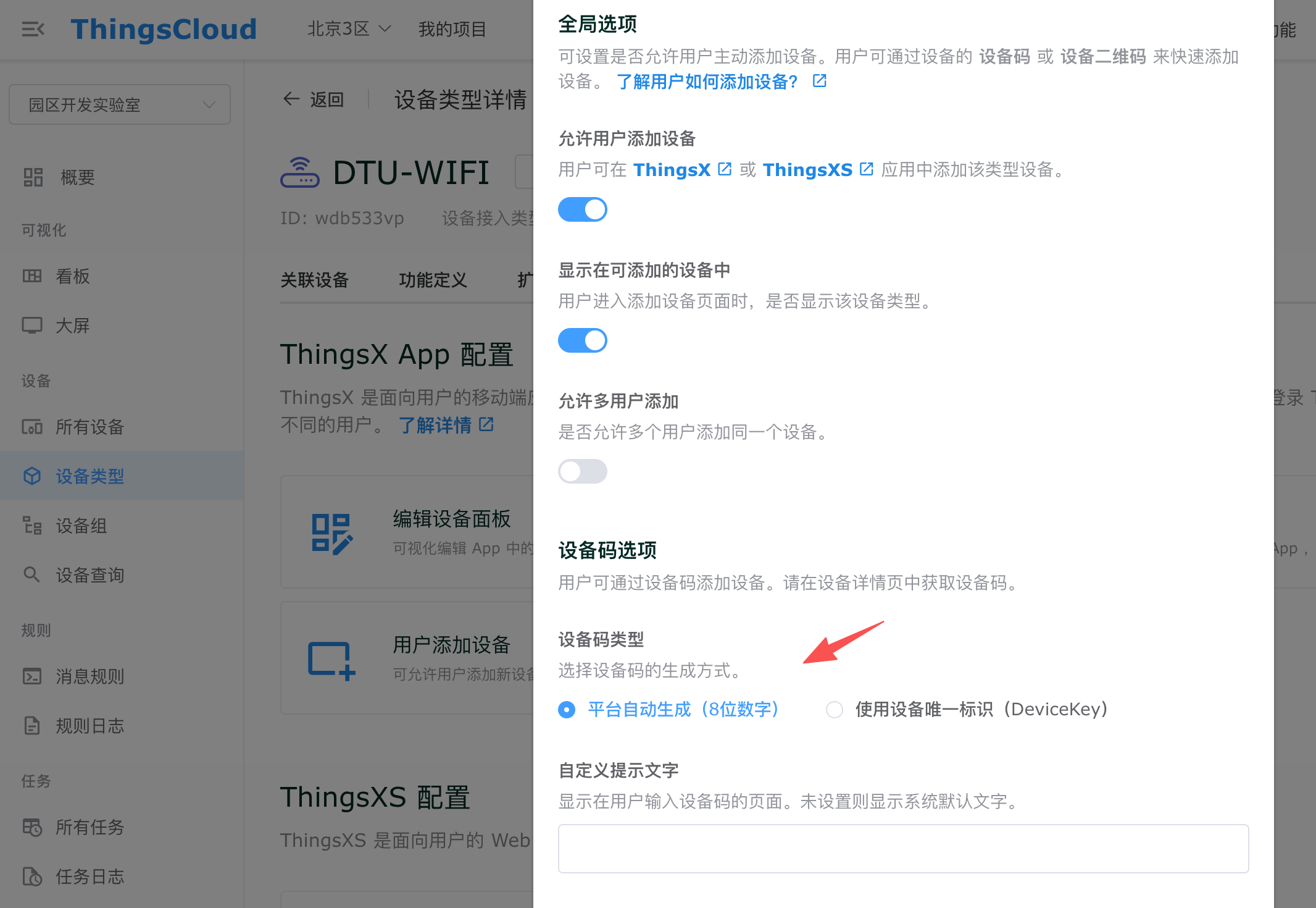 进入设备类型详情页,在 应用配置 → 用户添加设备 配置中,可以修改设备码类型。如下图: