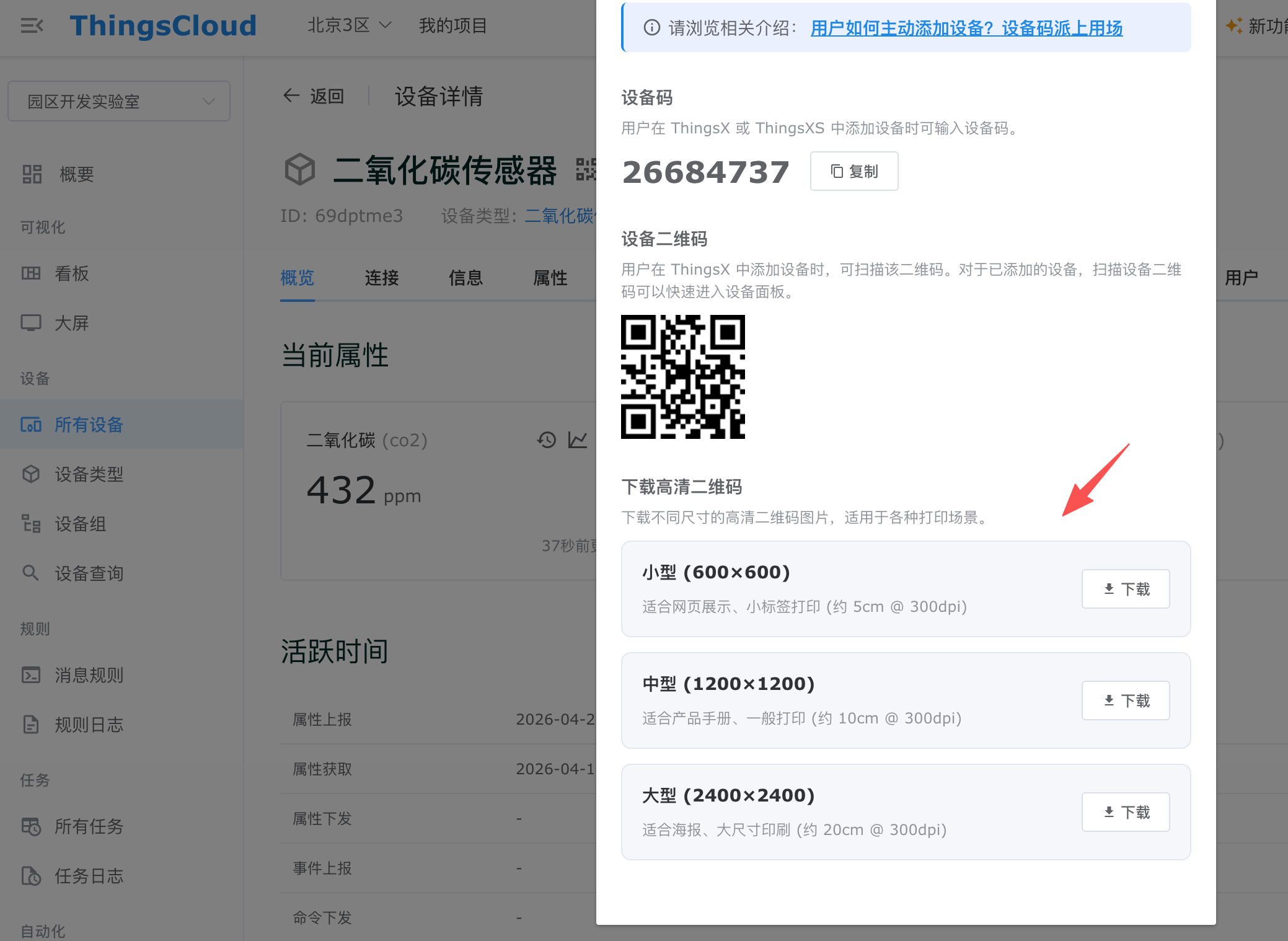 - 在控制台设备详情页重新查看并下载设备二维码。